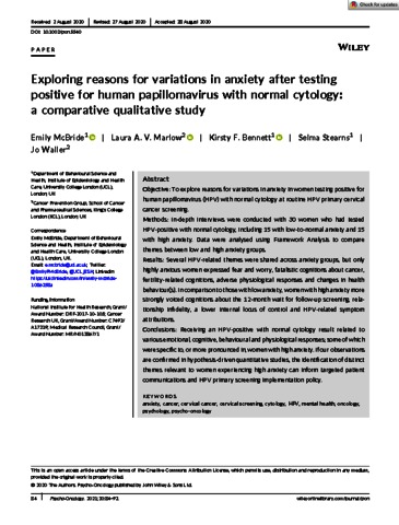 OBJECTIVE: To explore reasons for variations in anxiety in women testing positive for human papillomavirus (HPV) with normal cytology at routine HPV primary cervical cancer screening. METHODS: In-depth interviews were conducted with 30 women who had tested HPV-positive with normal cytology, including 15 with low-to-normal anxiety and 15 with high anxiety. Data were analysed using Framework Analysis to compare themes between low and high anxiety groups. RESULTS: Several HPV-related themes were shared across anxiety groups, but only highly anxious women expressed fear and worry, fatalistic cognitions about cancer, fertility-related cognitions, adverse physiological responses, and changes in health behaviour(s). In comparison to those with low anxiety, women with high anxiety more strongly voiced cognitions about relationship infidelity, the 12-month wait for follow-up screening, a lower internal locus of control, and HPV-related symptom attributions. CONCLUSIONS: Receiving an HPV-positive with normal cytology result related to various emotional, cognitive, behavioural, and physiological responses; some of which were specific to, or more pronounced in, women with high anxiety. If our observations are confirmed in hypothesis-driven quantitative studies, the identification of distinct themes relevant to women experiencing high anxiety can inform targeted patient communications and HPV primary screening implementation policy. This article is protected by copyright. All rights reserved.