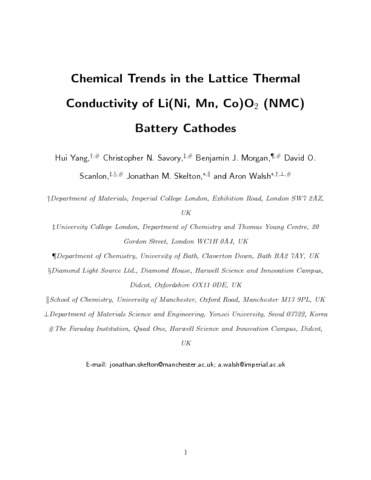 Title: | Chemical Trends in the Lattice Thermal Conductivity of Li(Ni, Mn, Co)O₂ (NMC) Battery Cathodes |