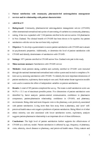 Title: | Patient satisfaction with community pharmacist-led anticoagulation management services and its relationship with patient characteristics in New Zealand |