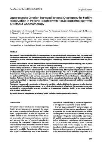 Title: | Laparoscopic Ovarian Transposition and Ovariopexy for Fertility Preservation in Patients Treated with Pelvic Radiotherapy with or without Chemotherapy |