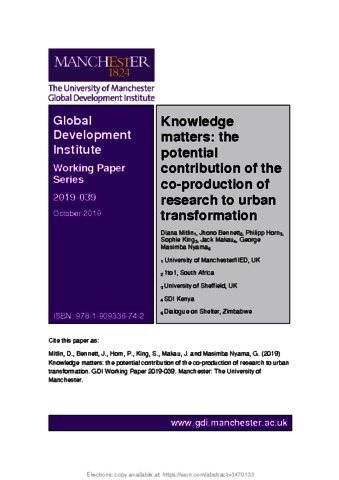 The purpose of this paper is to share our experiences—as academics and professionals—in coproducing knowledge to improve urban development outcomes in the global South. The focus of the paper is on urban research and practice, a field in which academic work influences policy and programming, and professional knowledge (validated and certified by academic institutions) forms the basis for urban planning and management. Collaborative research coproduced with social movement activities highlights that four issues need to be addressed to establish more equitable relations. First, alternative theories of change about how research leads to social transformation must be recognised, even if they cannot be reconciled. Second, the contribution of social movement leaders to university teaching needs to be institutionalised. Third, the relative status of academics vis-à-vis non-academics must be interrogated and better understood. Fourth, the accountabilities of the researchers to the marginalised need to be established. We argue that academics are insufficiently self-critical about the power dynamics involved in knowledge production with social movements. And that long-term relations enable understandings to be built and some of these tensions to be alleviated. Our conclusion highlights the unequal power relations that under-pin these challenges and suggests some steps to address these inequalities and their negative consequences.