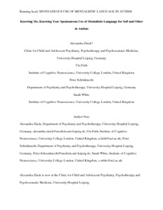 Title: | Knowing me, knowing you: Spontaneous use of mentalistic language for self and other in autism |