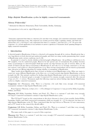 Title: | Edge Disjoint Hamiltonian Cycles in Highly Connected Tournaments |