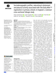 Title: | Sociodemographic profiles, educational attainment and physical activity associated with The Daily Mile™ registration in primary schools in England: a national cross-sectional linkage study |