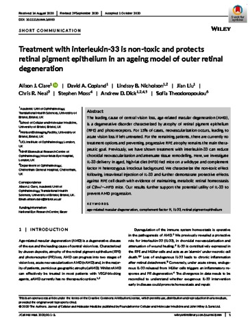 Title: | Treatment with interleukin-33 is non-toxic and protects retinal pigment epithelium in an ageing model of outer retinal degeneration |