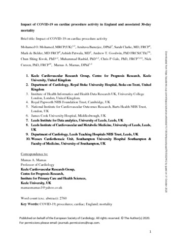 Title: | Impact of COVID-19 on cardiac procedure activity in England and associated 30-day mortality |