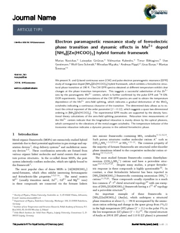 Title: | Electron paramagnetic resonance study of ferroelectric phase transition and dynamic effects in a Mn²⁺ doped [NH₄][Zn(HCOO)₃] hybrid formate framework |