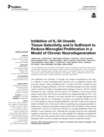 | Title: | Inhibition of IL-34 Unveils Tissue-Selectivity and Is Sufficient to Reduce Microglial Proliferation in a Model of Chronic Neurodegeneration |