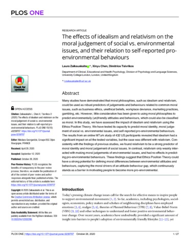 Title: | The effects of idealism and relativism on the moral judgement of social vs. environmental issues, and their relation to self-reported pro-environmental behaviours |