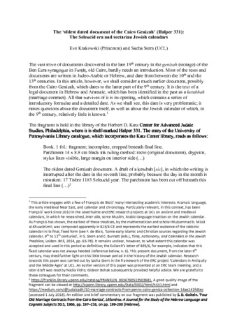 Halper 331 is the fragment of a codex that has been styled the ‘oldest dated document of the Cairo Genizah’. It preserves the opening of a Jewish legal document dated to the year 1182 (Seleucid era), which appears to have been copied into this codex, probably as a formulary, not long after this date, in the late 9th century. In this article, the text of this fragment, in Aramaic and Hebrew, is edited, and its identification as the beginning of a marriage contract (ketubbah) is evaluated. Its Egyptian provenance is questioned, partly because the earliest evidence for the introduction of the Seleucid era by Jews in Egypt dates from the mid-10th century. The article surveys the history of Jewish dating methods in early medieval Egypt and the Near East, in an attempt to clarify this question. The specific date of the document deviates from the rabbinic calendar, but agrees with that of the contemporary Jewish Near Eastern sectarian groups of Abū ʿImrān al-Tiflīsī and Ismāʿīl al-ʿUkbarī; this document could thus uniquely attest one of these sectarian Jewish calendars.