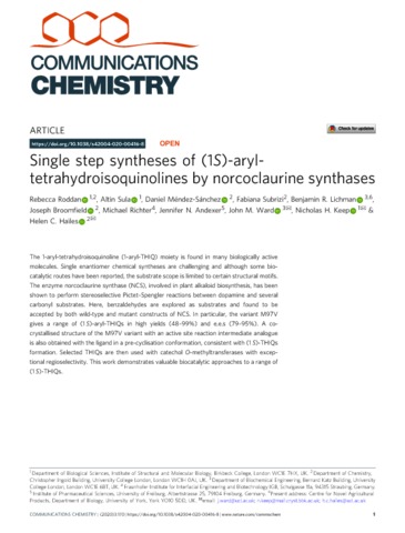 | Title: | Single step syntheses of (1S)-aryl-tetrahydroisoquinolines by norcoclaurine synthases |