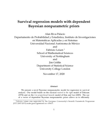 Survival Regression Models With Dependent Bayesian Nonparametric Priors.