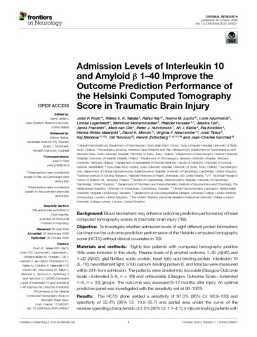 Additional information: | © 2020 Posti, Takala, Raj, Luoto, Azurmendi, Lagerstedt, Mohammadian, Hossain, Gill, Frantzén, van Gils, Hutchinson, Katila, Koivikko, Maanpää, Menon, Newcombe, Tallus, Blennow, Tenovuo, Zetterberg and Sanchez. This is an open-access article distributed under the terms of the Creative Commons Attribution License (http://creativecommons.org/licenses/by/4.0/). |