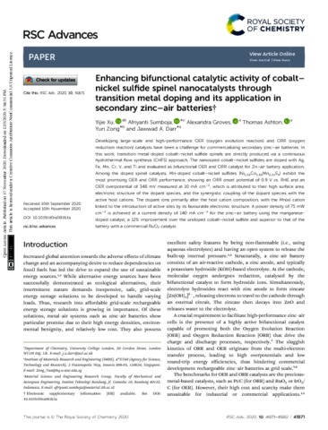 Title: | Enhancing bifunctional catalytic activity of cobalt-nickel sulfide spinel nanocatalysts through transition metal doping and its application in secondary zinc-air batteries |