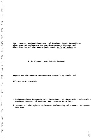 Title: | The recent palaeolimnology of Woolmer Pond, Hampshire, with special reference to the documentary history and distribution of the Natterjack toad, Bufo calamita L. |