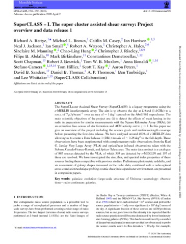 The SuperCLuster Assisted Shear Survey (SuperCLASS) is a legacy programme using the e-MERLIN interferometric array. The aim is to observe the sky at L-band (1.4 GHz) to a r.m.s. of 7μJybeam−1 over an area of ∼1deg2 centred on the Abell 981 supercluster. The main scientific objectives of the project are: (i) to detect the effects of weak lensing in the radio in preparation for similar measurements with the Square Kilometre Array (SKA); (ii) an extinction free census of star formation and AGN activity out to z ∼ 1. In this paper we give an overview of the project including the science goals and multiwavelength coverage before presenting the first data release. We have analysed around 400 h of e-MERLIN data allowing us to create a Data Release 1 (DR1) mosaic of ∼0.26deg2 to the full depth. These observations have been supplemented with complementary radio observations from the Karl G. Jansky Very Large Array (VLA) and optical/near infrared observations taken with the Subaru, Canada-France-Hawaii, and Spitzer Telescopes. The main data product is a catalogue of 887 sources detected by the VLA, of which 395 are detected by e-MERLIN and 197 of these are resolved. We have investigated the size, flux, and spectral index properties of these sources finding them compatible with previous studies. Preliminary photometric redshifts, and an assessment of galaxy shapes measured in the radio data, combined with a radio-optical cross-correlation technique probing cosmic shear in a supercluster environment, are presented in companion papers.