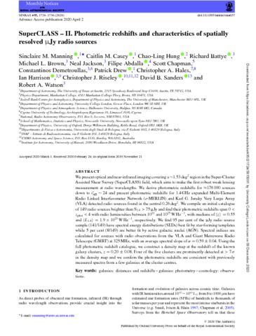 Title: | SuperCLASS - II. Photometric redshifts and characteristics of spatially resolved mu Jy radio sources |