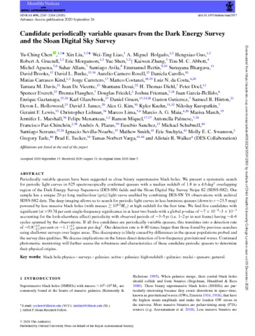 Title: | Candidate periodically variable quasars from the Dark Energy Survey and the Sloan Digital Sky Survey |