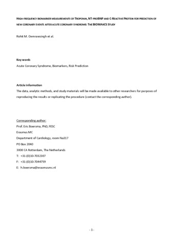 Title: | High-Frequency Biomarker Measurements of Troponin, NT-proBNP, and C-Reactive Protein for Prediction of New Coronary Events After Acute Coronary Syndrome BIOMArCS Study |
