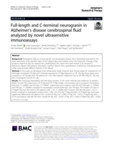 Title: | Full-length and C-terminal neurogranin in Alzheimer's disease cerebrospinal fluid analyzed by novel ultrasensitive immunoassays |