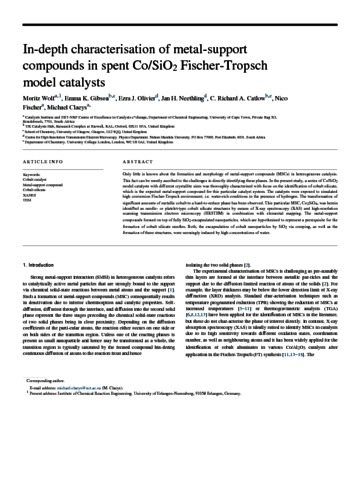 Title: | In-depth characterisation of metal-support compounds in spent Co/SiO2 Fischer-Tropsch model catalysts |