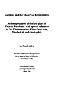 | Title: | Carnival and the theatre of eccentricity: An interpretation of the late plays of Thomas Bernhard, with special reference to Der Theatermacher, Ritter Dene Voss, Elisabeth II and Heldenplatz |