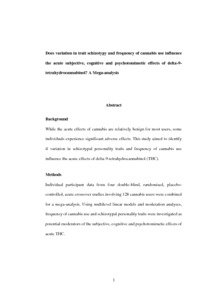 Title: | Does variation in trait schizotypy and frequency of cannabis use influence the acute subjective, cognitive and psychotomimetic effects of delta-9-tetrahydrocannabinol? A mega-analysis |