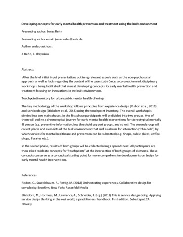 Title: | Developing concepts for early mental health prevention and treatment using the built environment |