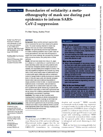 Title: | Boundaries of solidarity: a meta-ethnography of mask use during past epidemics to inform SARS-CoV-2 suppression |