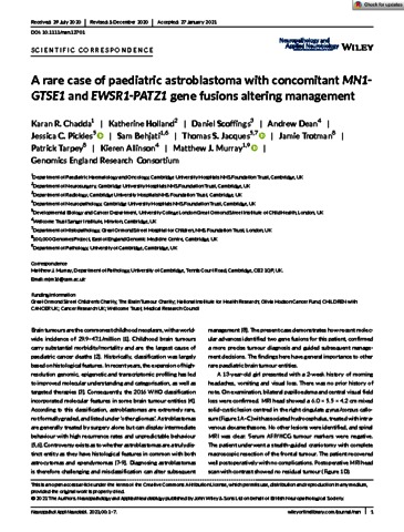 | Title: | A rare case of paediatric astroblastoma with concomitant MN1-GTSE1 and EWSR1-PATZ1 gene fusions altering management |