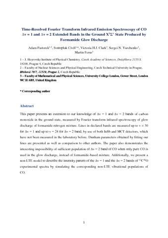 Title: | Time-resolved Fourier transform infrared emission spectroscopy of CO ∆v = 1 and ∆v = 2 extended bands in the ground X1Σ+ state produced by formamide glow discharge |