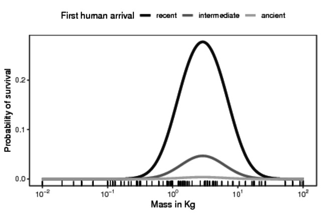 Preventing extinctions requires understanding macroecological patterns of vulnerability or persistence. However, correlates of risk can be nonlinear, within-species risk varies geographically, and current-day threats cannot reveal drivers of past losses. We investigated factors that regulated survival or extinction in Caribbean mammals, which have experienced the globally highest level of human-caused postglacial mammalian extinctions, and included all extinct and extant Holocene island populations of non-volant species (219 survivals or extinctions across 118 islands). Extinction selectivity shows a statistically detectable and complex body mass effect, with survival probability decreasing for both mass extremes, indicating that intermediatesized species have been more resilient. A strong interaction between mass and age of first human arrival provides quantitative evidence of larger mammals going extinct on the earliest islands colonized, revealing an extinction filter caused by past human activities. Survival probability increases on islands with lower mean elevation (mostly small cays acting as offshore refugia) and decreases with more frequent hurricanes, highlighting the risk of extreme weather events and rising sea levels to surviving species on low-lying cays. These findings demonstrate the interplay between intrinsic biology, regional ecology and specific local threats, providing insights for understanding drivers of biodiversity loss across island systems and fragmented habitats worldwide.