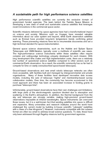 High-performance scientific satellites are currently the exclusive domain of government-funded agencies. The team behind the Twinkle Space Mission is developing a new class of small and sustainable science satellites that leverages recent innovations in the commercial space sector.