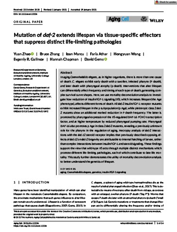 Title: | Mutation of daf‐2 extends lifespan via tissue‐specific effectors that suppress distinct life‐limiting pathologies |