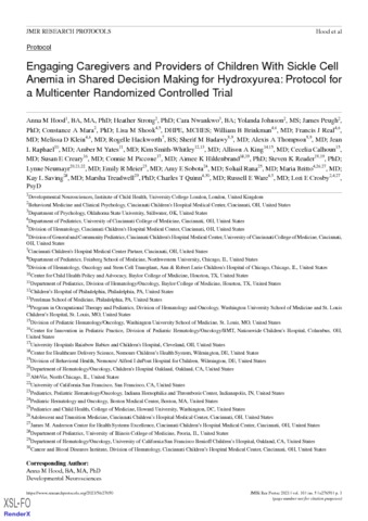 Hood_Engaging Caregivers and Providers of Children With Sickle Cell Anemia in Shared Decision Making for Hydroxyurea- Protocol for a Multicenter Randomized Controlled Trial_VoR.pdf - Published Version Download (1MB) | Preview |