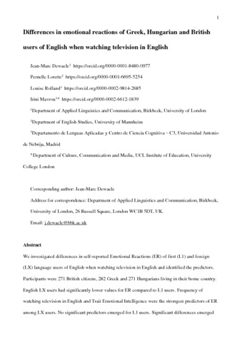 Title: | Differences in emotional reactions of Greek, Hungarian, and British users of English when watching television in English |