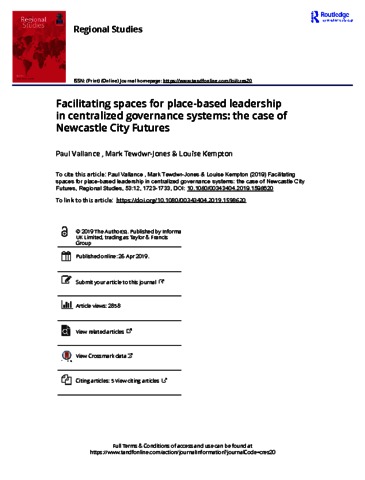 | Title: | Facilitating spaces for place-based leadership in centralized governance systems: the case of Newcastle City Futures |