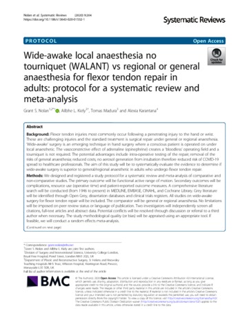 Title: | Wide-awake local anaesthesia no tourniquet (WALANT) vs regional or general anaesthesia for flexor tendon repair in adults: protocol for a systematic review and meta-analysis. |