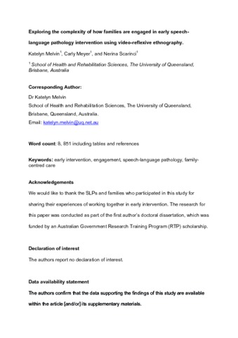 Title: | Exploring the complexity of how families are engaged in early speech-language pathology intervention using video-reflexive ethnography |
