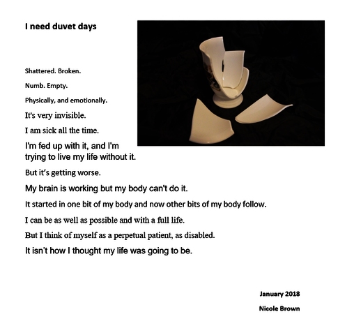 As part of my research I worked with chronically ill academics to create representations of experiences. This is an example for an illustrated poem that was created from actual statements in interview transcripts. This illustrated poem was first published in February 2018 as part of the Anthology “Translating Chronic Pain”.