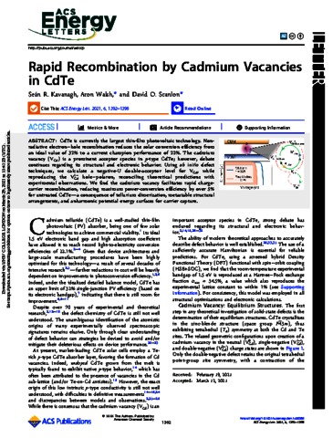 Scanlon_Rapid Recombination by Cadmium Vacancies in CdTe_VoR.pdf - Published Version Download (1MB) | Preview |