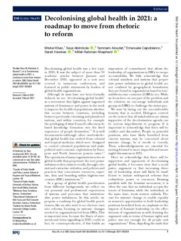 | Title: | Decolonising global health in 2021: a roadmap to move from rhetoric to reform. |