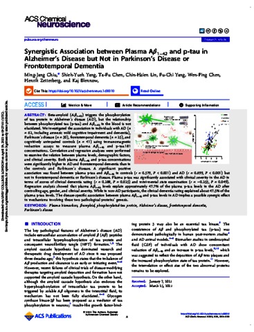 | Title: | Synergistic Association between Plasma Aβ1-42 and p-tau in Alzheimer's Disease but Not in Parkinson's Disease or Frontotemporal Dementia |