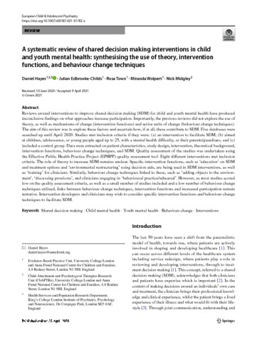 Title: | A systematic review of shared decision making interventions in child and youth mental health: synthesising the use of theory, intervention functions, and behaviour change techniques |