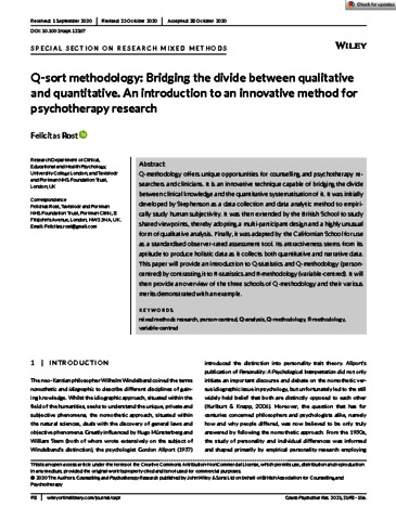 Title: | Q‐sort methodology: Bridging the divide between qualitative and quantitative. An introduction to an innovative method for psychotherapy research |