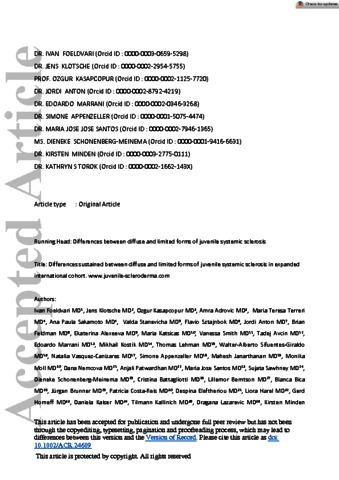 Title: | Differences sustained between diffuse and limited forms of juvenile systemic sclerosis in expanded international cohort. www.juvenile-scleroderma.com |
