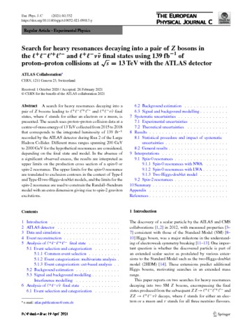 Title: | Search for heavy resonances decaying into a pair of Z bosons in the ℓ⁺ ℓ ¯ℓ'⁺ ℓ'¯ and ℓ⁺ ℓ¯ν\bar{ν} states using 139 fb¯¹ of proton–proton collisions at \sqrt{s} = 13 TeV with the ATLAS detector |