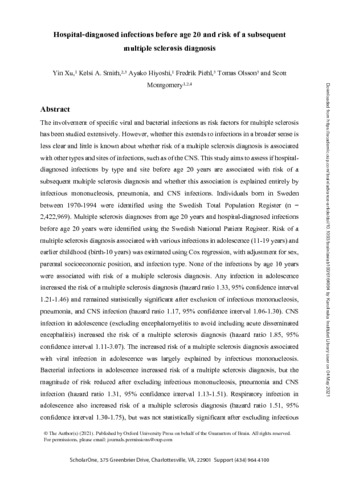 Title: | Hospital-diagnosed infections before age 20 and risk of a subsequent multiple sclerosis diagnosis |