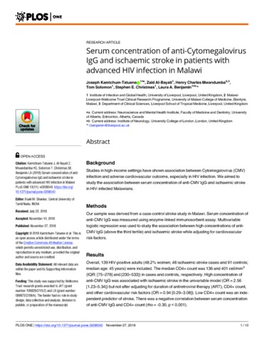 Title: | Serum concentration of anti-Cytomegalovirus IgG and ischaemic stroke in patients with advanced HIV infection in Malawi |