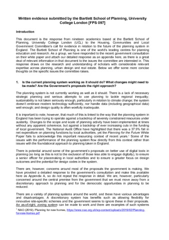 This document is the response from nineteen academics based at the Bartlett School of Planning, University College London (UCL) to the government’s White Paper Planning for the Future. The Bartlett School of Planning is one of the world’s leading centres for planning education and research. This response draws on the research and understanding of scholars with considerable relevant expertise across planning, urban design and real estate.